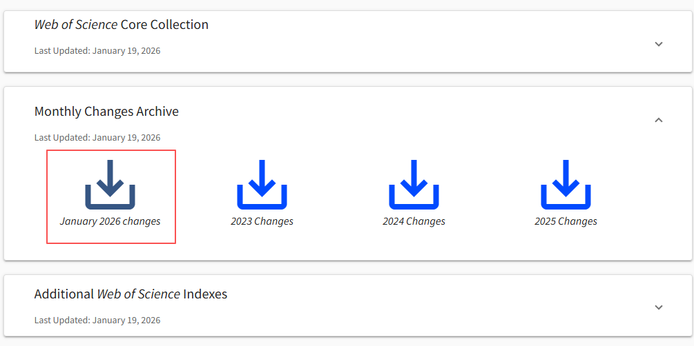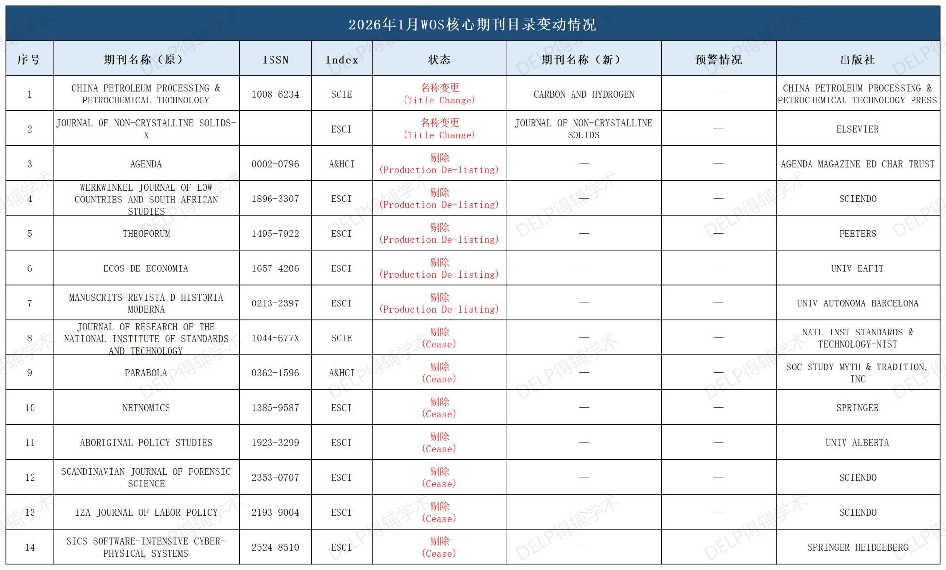 2026年1月19日,Web of Science(WOS)数据库进行了本年度首次核心期刊目录更新。本次更新涉及14本期刊的变动: