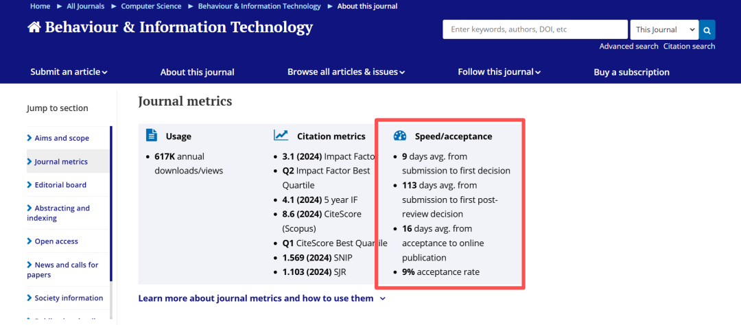 查看期刊官网“Journal Metrics”中关于审稿速度的数据。