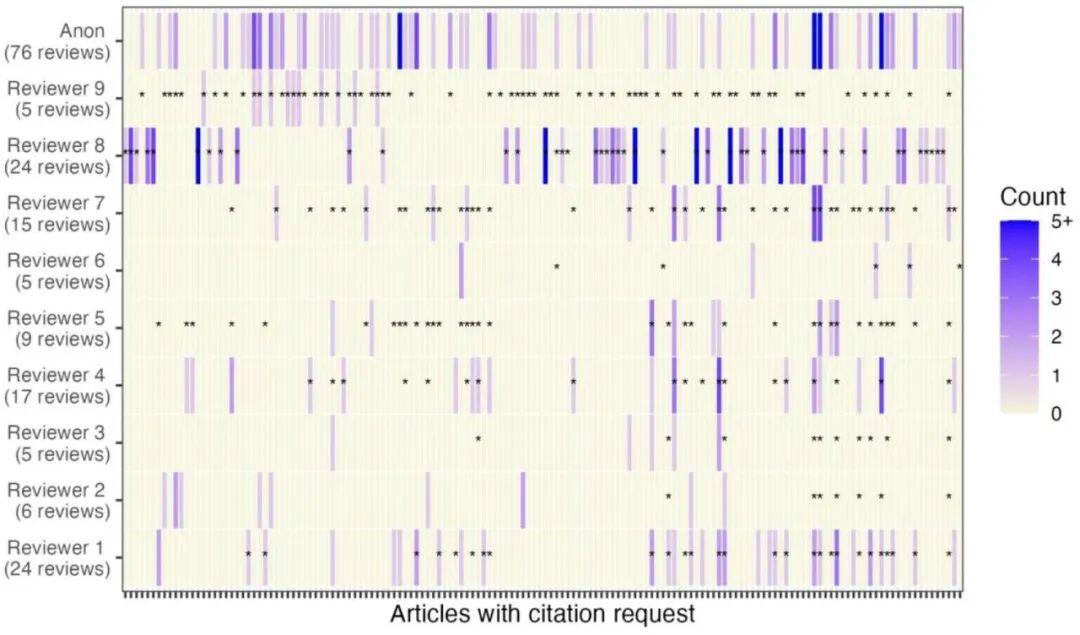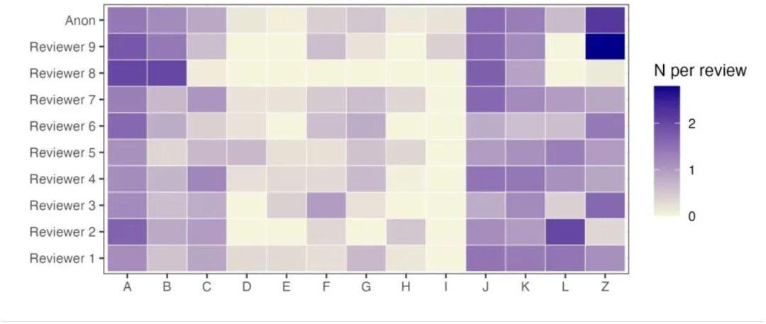 其中深色表示 9 名审阅者以及匿名审阅者 (Anon) 的每次审阅的平均评论数