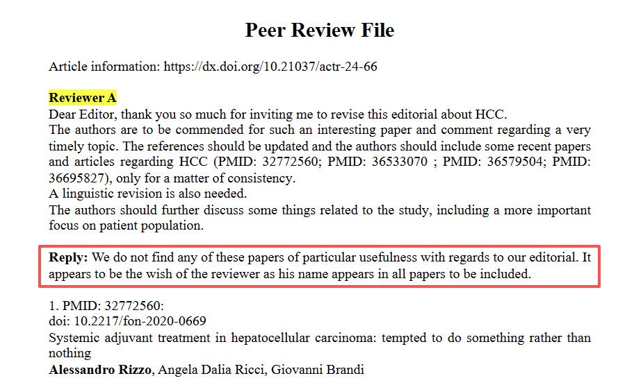 强制引用:在195份可疑评审中,有186份(占比95.4%)建议引用至少一篇由评审人自己或其“工厂”成员合著的论文。这些建议通常只提供PMID或DOI,刻意隐去作者姓名以增加隐蔽性。在可评估的论文中,高达78%的作者部分或全部遵从了这些强制引用要求。