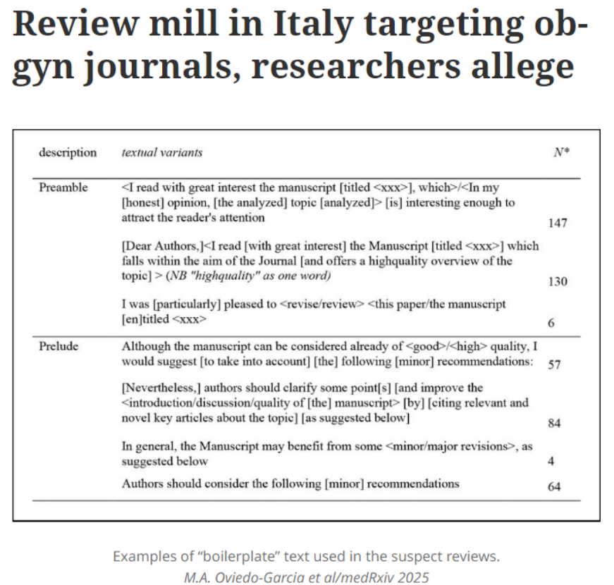 2025年10月,一项在预印本平台medRxiv发布的研究进一步揭露了意大利妇产科领域的学术黑幕。研究发起人Dorothy Bishop等人最初在一篇同行评审中发现“模板化”评语,循此线索深入调查,最终锁定2019年2月至2025年7月期间发表的170篇论文,涉及195份可疑评审记录。