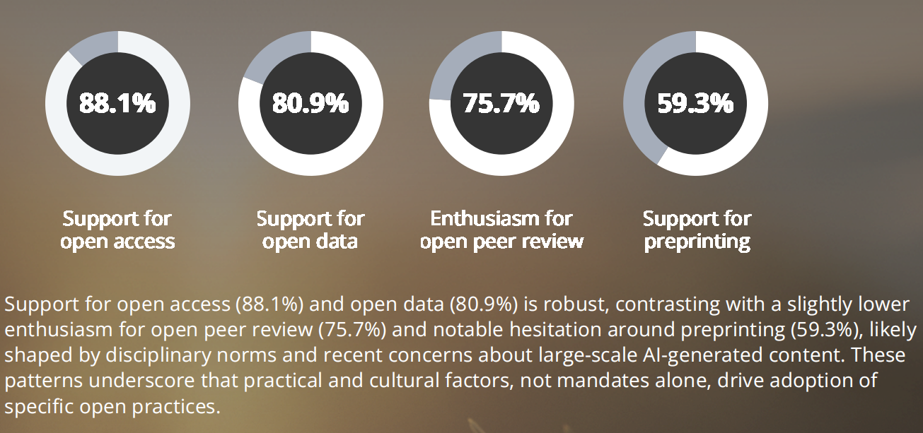88.1%的受访者支持开放获取;80.9%支持开放数据;75.7%赞同开放同行评审。科研人员普遍看重开放性,但强调需要更可行的工作流程以实现其可持续性。