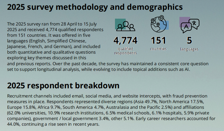 Digital Science公司、Figshare知识库和Springer Nature于本周连续第十年发布《2025年开放数据状况:十年进展与挑战》全球报告。报告显示,开放数据已深度融入科研实践,FAIR原则获得广泛认可,人工智能(AI)正重塑科研工作流程,科研人员对开放科学实践的支持度继续保持高位。