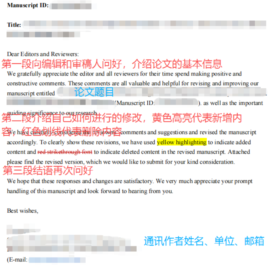 修改说明(核心部分):概述总体修改情况。为便于审阅,需明确说明稿件中的修改标记规则(例如:黄色高亮代表新增,删除线代表删除)。